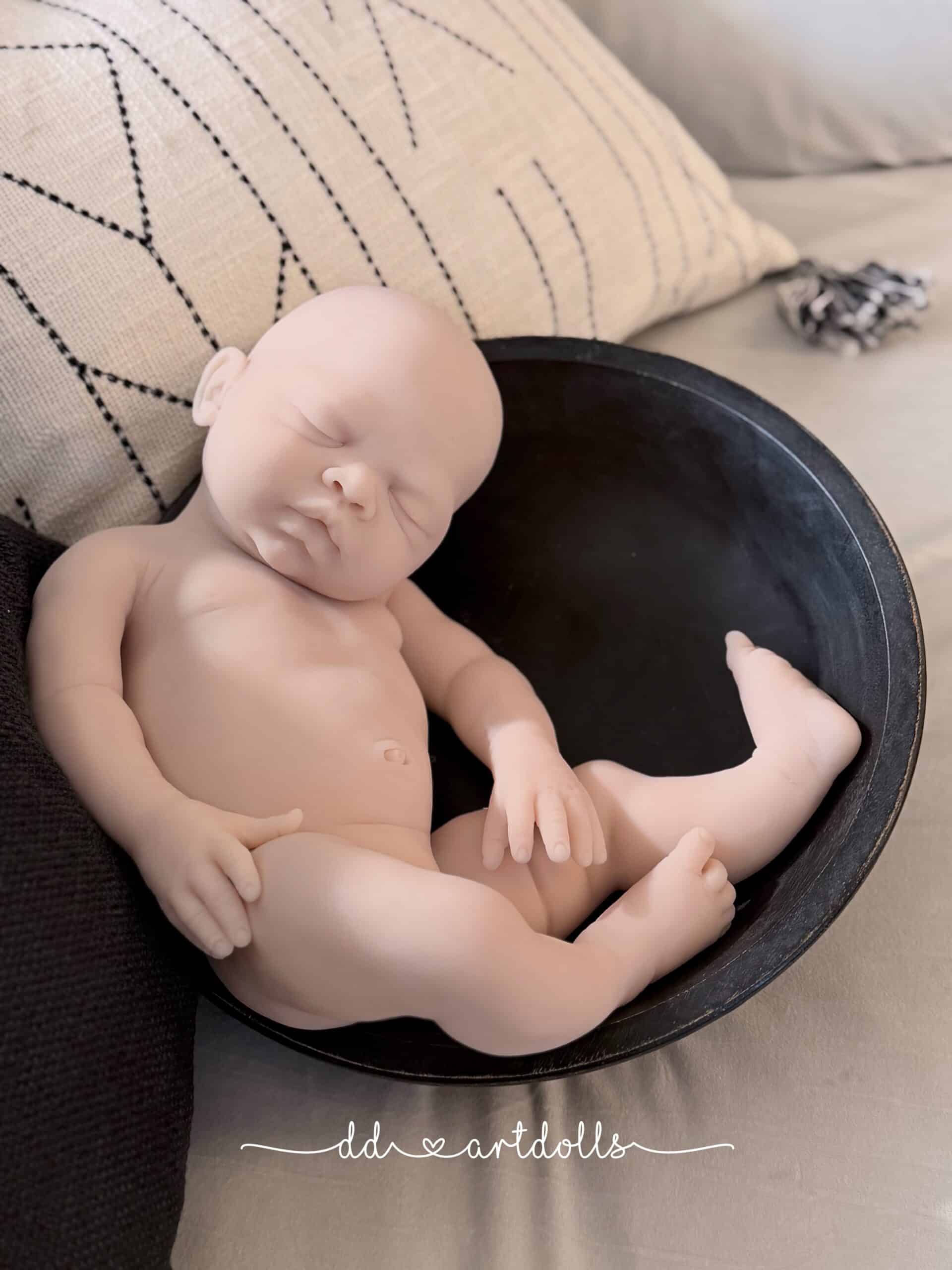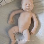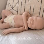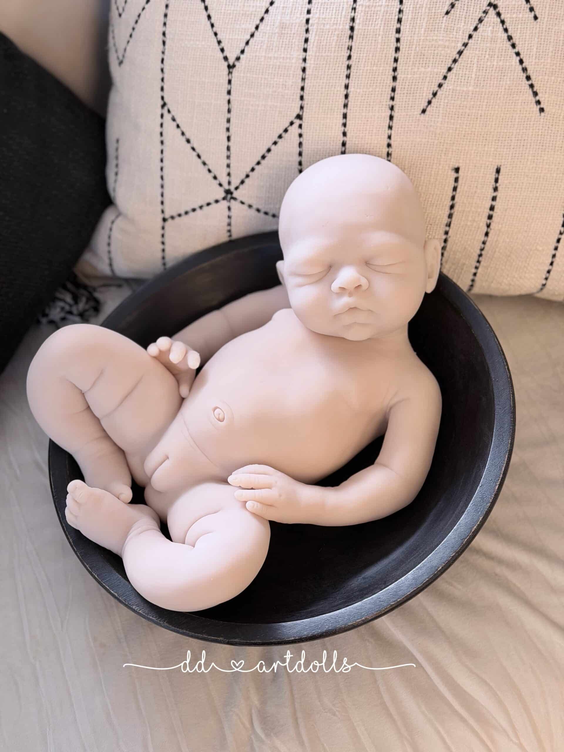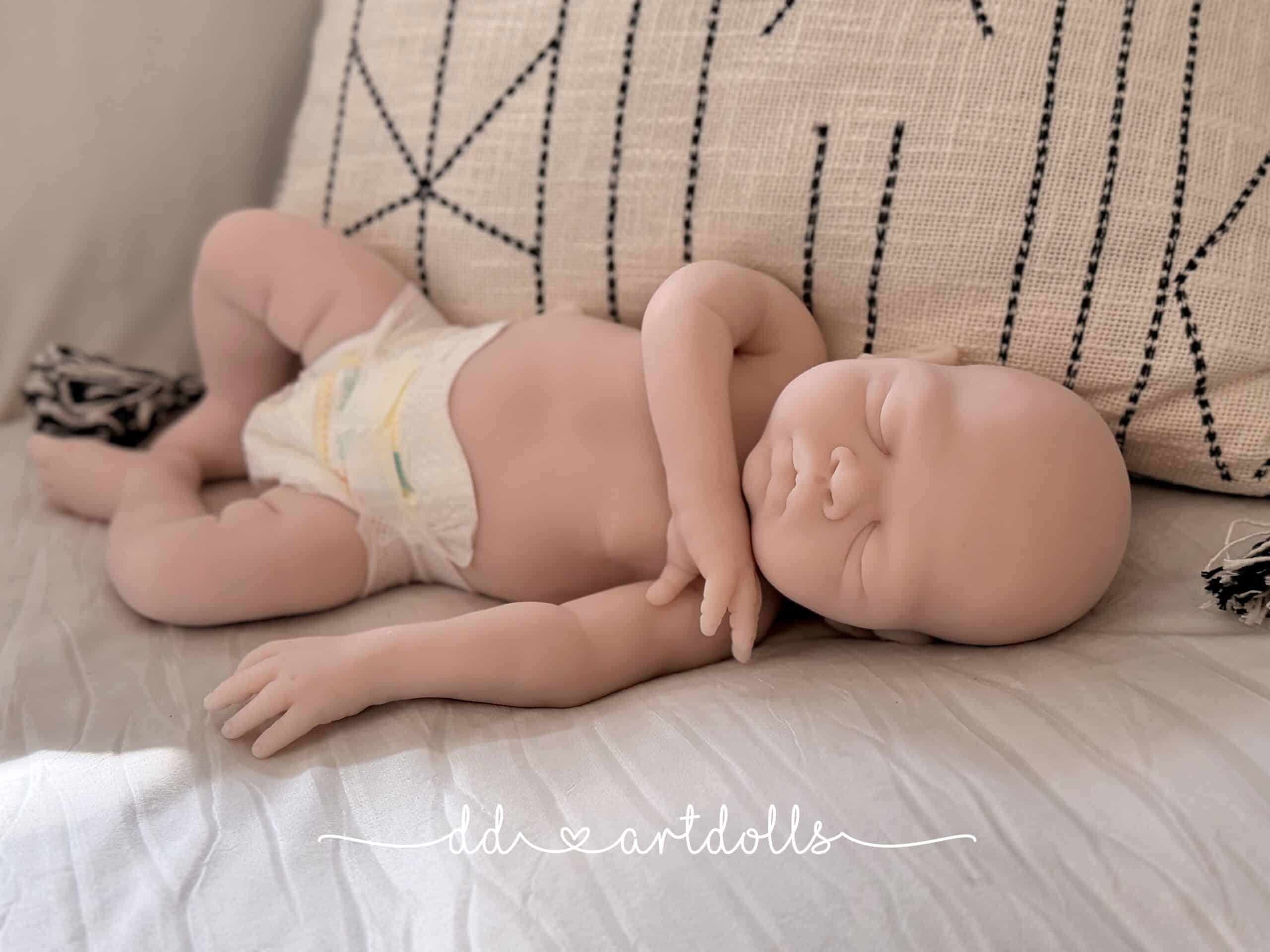 River Sleeping is a BLANK full-body silicone doll kit, sculpted and poured by me, Dawn Donofrio, in beautiful, SUPER-soft blend platinum silicone. This adorable preemie-size baby doll is a dream to cuddle and pose! You will be amazed by the softness and texture of the silicone. This is the SECOND molding/edition of River Sleeping – River now has TWO OPEN HANDS – so the one you will receive will have open hands (see photos). The baby pictured with upen hands has no armatures installed.