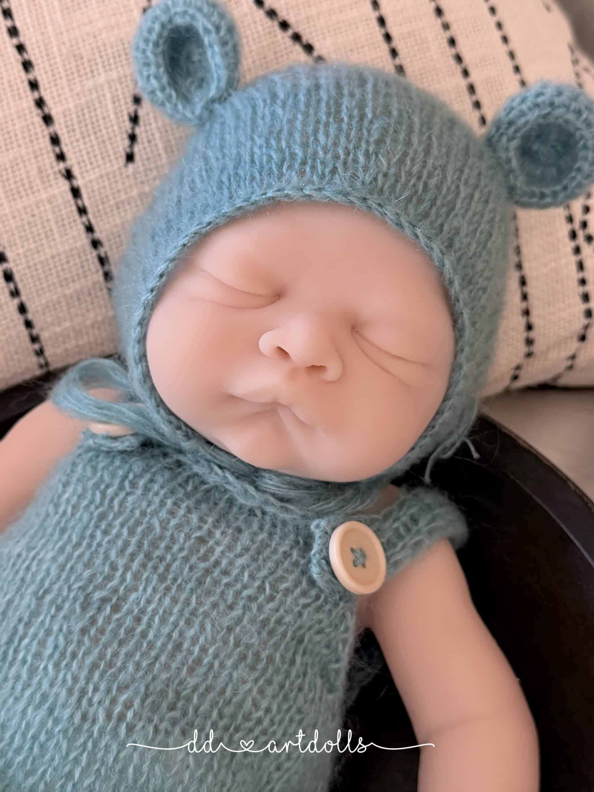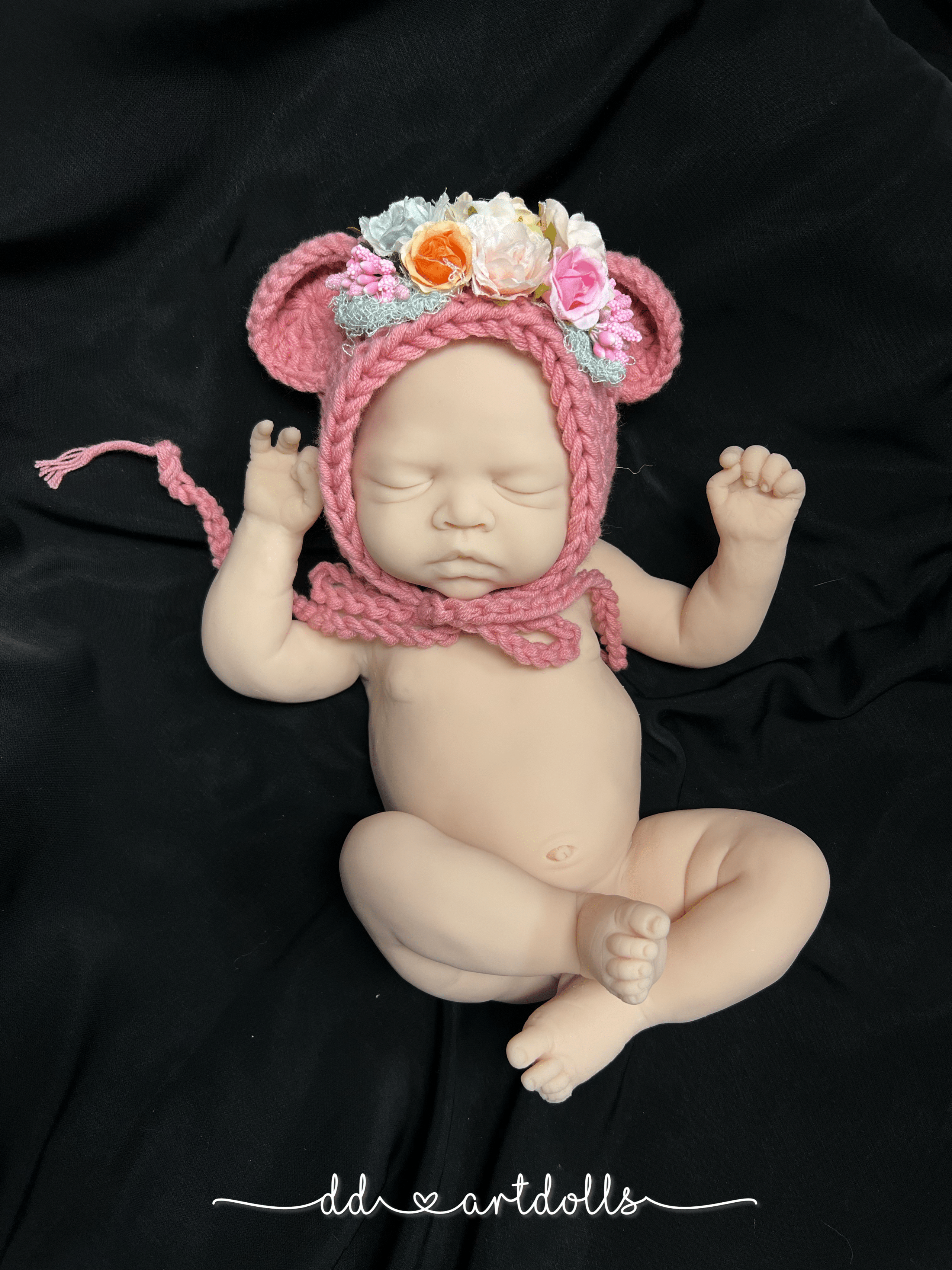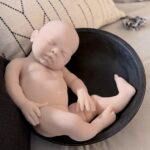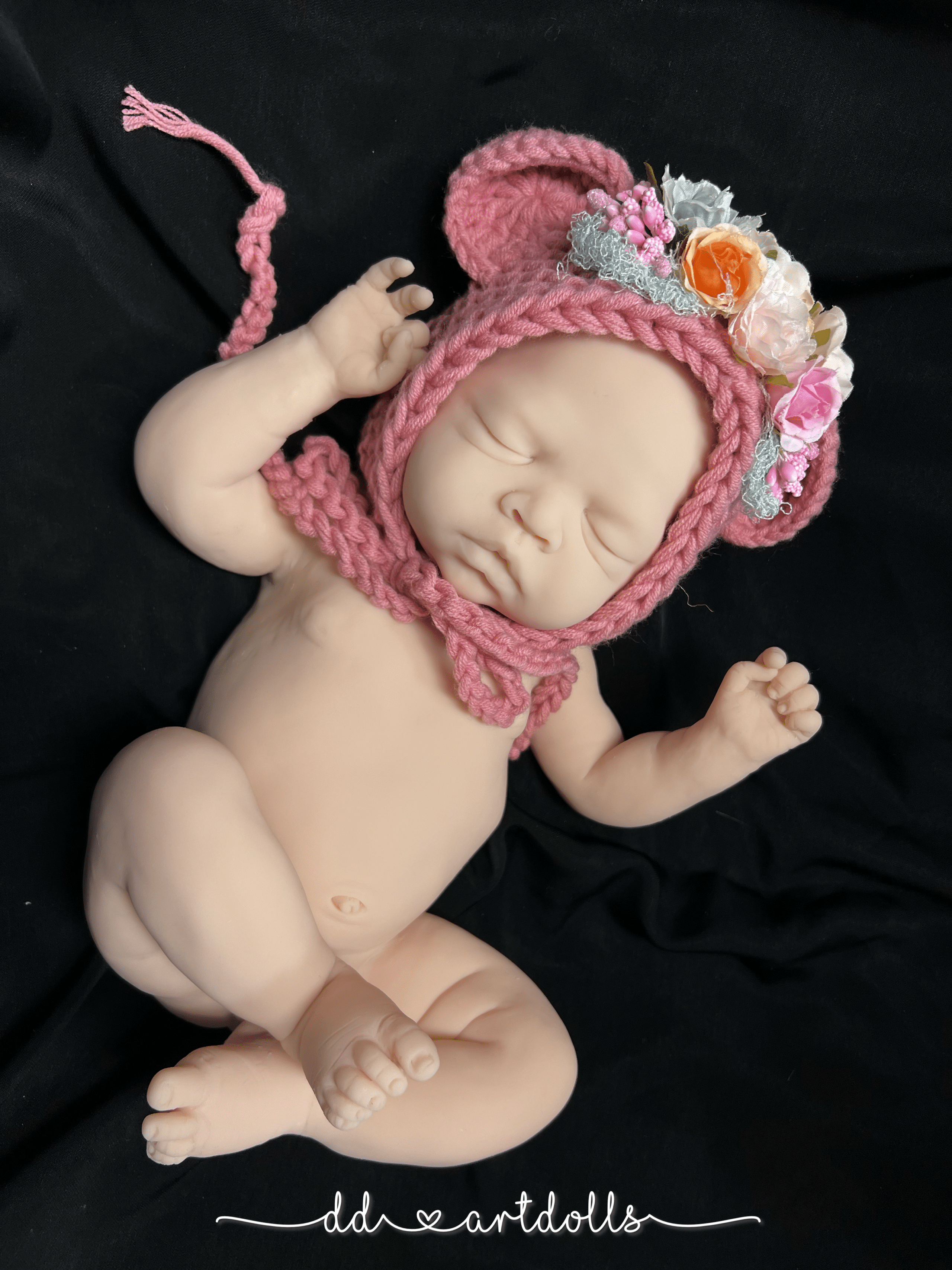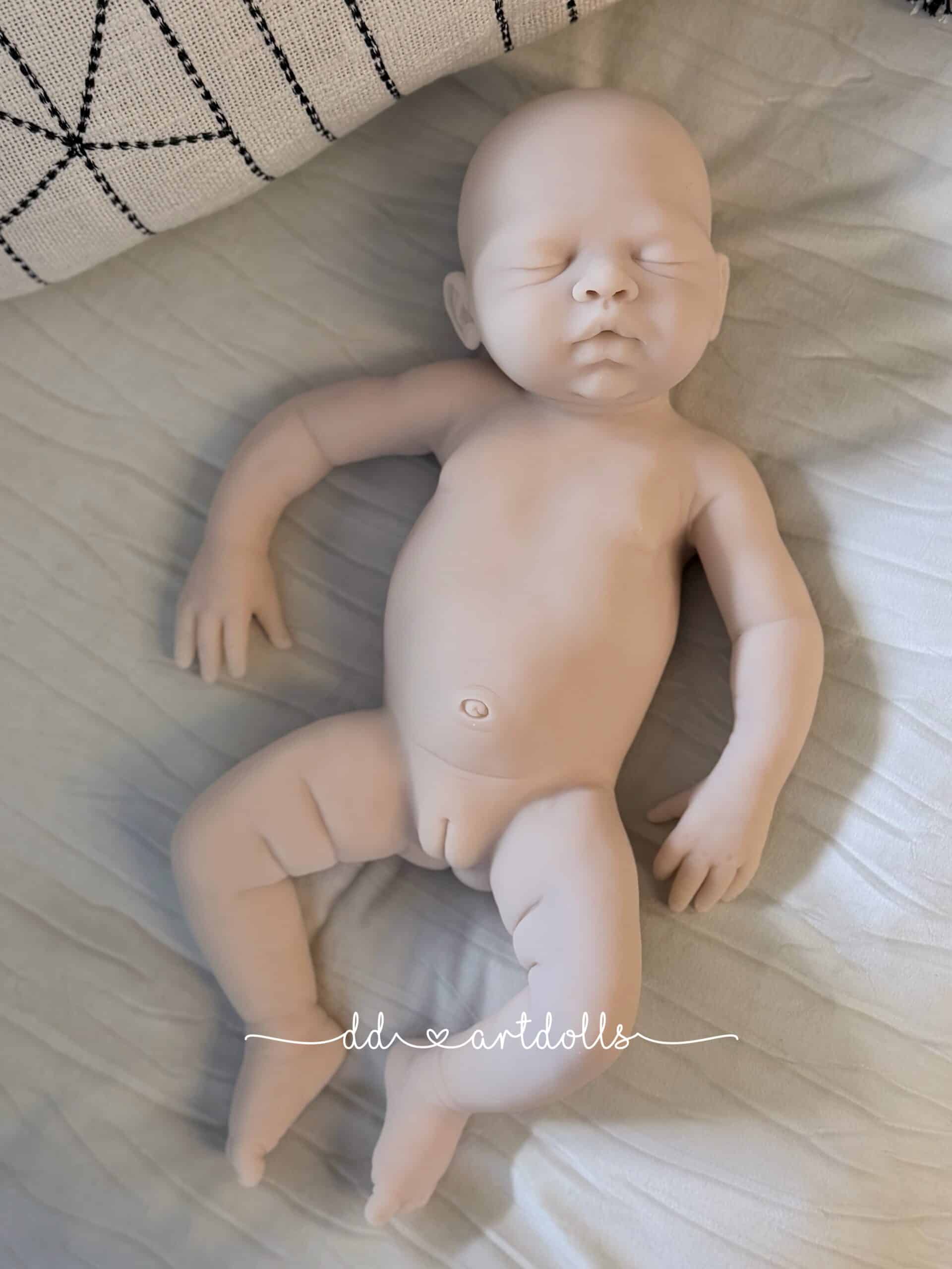 River Sleeping is a BLANK full-body silicone doll kit, sculpted and poured by me, Dawn Donofrio, in beautiful, SUPER-soft blend platinum silicone. This adorable preemie-size baby doll is a dream to cuddle and pose! You will be amazed by the softness and texture of the silicone. This is the SECOND molding/edition of River Sleeping – River now has TWO OPEN HANDS – so the one you will receive will have open hands (see photos). The baby pictured with upen hands has no armatures installed.